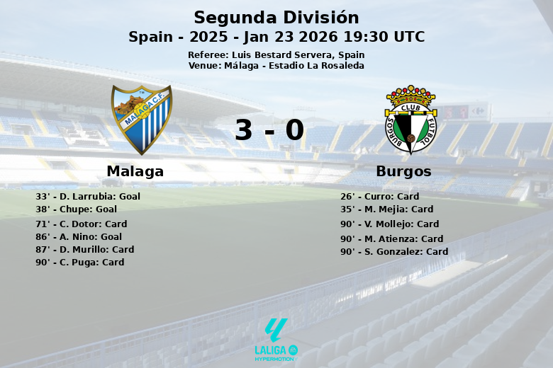 Málaga, Espanha – Em uma partida disputada no Estádio La Rosaleda, o Málaga impôs-se com autoridade ao Burgos com um placar de 3 a 0. O encontro, correspondente à 23ª rodada da Segunda Divisão, viu o Málaga dominar a posse de bola com 58%, contra 42% do Burgos.
