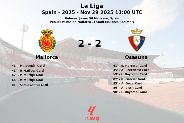 Parecia que o Mallorca tinha o jogo sob controle, mas o Osasuna reagiu com força nos minutos finais. Aos 82 minutos, R. Garcia descontou para o Osasuna, devolvendo a esperança à sua equipe. A insistência do Osasuna deu frutos aos 90 minutos, quando F. Boyomo empatou a partida, deixando o placar final em 2-2.