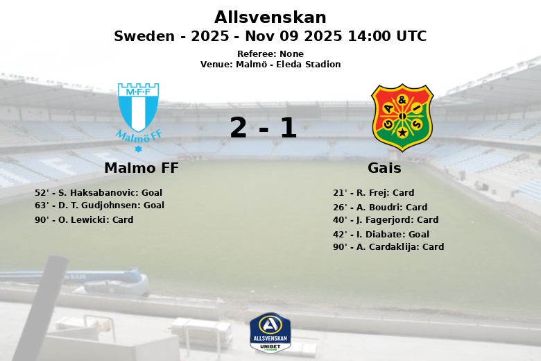 Malmö, Suécia – Em um jogo realizado no Eleda Stadion, o Malmö FF derrotou o GAIS por 2 a 1 em uma partida correspondente à 30ª rodada da Allsvenskan. O domínio do Malmö, refletido em 53% de posse de bola, traduziu-se em um jogo ofensivo constante. Apesar da pressão, o GAIS conseguiu abrir o placar aos 42 minutos, graças a um pênalti convertido por I. Diabate. No entanto, a alegria durou pouco, pois o Malmö respondeu com gols de S. Haksabanovic aos 52 minutos e D. T. Gudjohnsen aos 63 minutos, este último com assistência de K. Busuladzic.