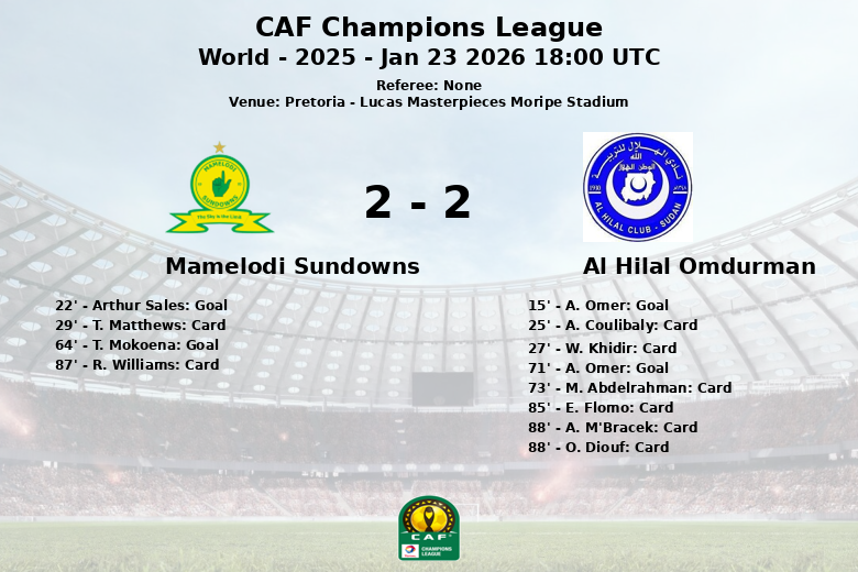 O Al Hilal Omdurman surpreendeu inicialmente ao abrir o placar aos 15 minutos com um gol de A. Omer. No entanto, a alegria durou pouco, pois Arthur Sales empatou para o Sundowns aos 22 minutos, assistido por N. Santos. O domínio do Sundowns tornou-se evidente no segundo tempo, quando T. Mokoena, assistido por T. Matthews, marcou o gol que garantiria a vitória aos 64 minutos. O Al Hilal respondeu com um segundo gol de A. Omer aos 71 minutos, mas não foi suficiente para igualar as ações.