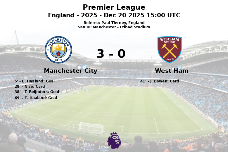 O West Ham, por outro lado, foi superado em todos os aspectos do jogo. Apesar de tentar criar perigo com 7 chutes, apenas 3 encontraram a rede adversária. A posse de bola, com 34%, refletiu a dificuldade da equipe visitante em impor seu jogo. A partida também teve momentos de tensão, com cartões amarelos para Nico do Manchester City (28′) e J. Bowen do West Ham (41′). A partida, apitada por Paul Tierney, foi caracterizada pelo domínio absoluto do Manchester City no Etihad Stadium.