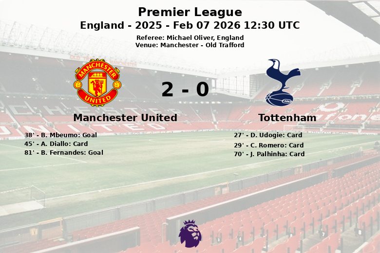 O primeiro gol da partida ocorreu aos 38 minutos, marcado por B. Mbeumo, após uma assistência de K. Mainoo, colocando o Manchester United em vantagem. O segundo gol, que selou a vitória, foi marcado por B. Fernandes aos 81 minutos, com assistência de D. Dalot. Apesar das tentativas do Tottenham de reagir, sua desvantagem numérica e a sólida defesa do Manchester United impediram que diminuíssem a diferença no placar.