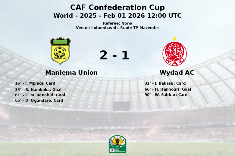 O Maniema Union abriu o placar aos 33 minutos com um gol de B. Namboka, com assistência de C. Ozome. No entanto, a alegria local foi efêmera, já que um gol contra de E. M. Benabid aos 61 minutos igualou o marcador. O Wydad AC aproveitou um pênalti aos 66 minutos, convertido por H. Hannouri, para assumir a liderança.