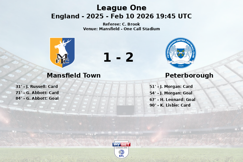 O primeiro tempo permaneceu sem gols, pontuado apenas por um cartão amarelo para J. Russell do Mansfield Town aos 31 minutos. O segundo tempo ganhou vida com um gol de J. Morgan do Peterborough aos 54 minutos, assistido por C. Hayes. O Peterborough ampliou a vantagem aos 67 minutos com um gol de H. Leonard, assistido por B. Khela.