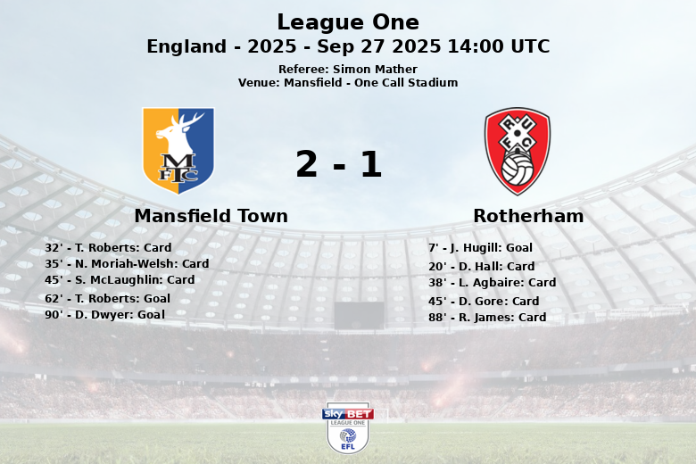 Mansfield, Inglaterra – Em uma partida disputada no One Call Stadium, Mansfield Town e Rotherham United empataram em um jogo cheio de intensidade e cartões. Rotherham abriu o placar logo aos 7 minutos com um gol de pênalti de J. Hugill, mas o Mansfield Town respondeu com força no segundo tempo.