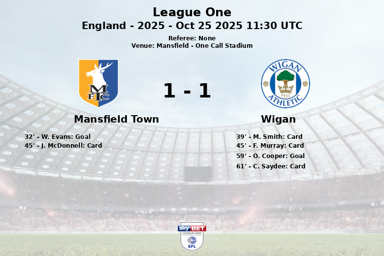 O Wigan Athletic, com 38% de posse de bola, lutou para impor seu jogo e encontrou o empate aos 59 minutos através de O. Cooper, que aproveitou uma assistência de M. Fox. A partida foi caracterizada por uma alta intensidade, refletida nas 12 faltas cometidas por ambas as equipes. O árbitro mostrou cartões amarelos para M. Smith, F. Murray e C. Saydee pelo Wigan, e para J. McDonnell pelo Mansfield Town. Apesar dos esforços de ambas as equipes, o placar não se moveu mais, culminando em um empate que deixa um sabor agridoce para ambos os conjuntos. O encontro se desenvolveu no âmbito da temporada de 2025 da League One.