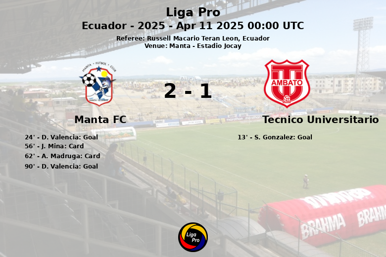 Em um emocionante jogo disputado no Estádio Jocay, em Manta, o Manta FC venceu o Técnico Universitario por 2 a 1 na oitava rodada da Liga Pro 2025. A partida, realizada em 11 de abril de 2025 e arbitrada por Russell Macario Teran Leon, foi um constante intercâmbio de ataques. Steven González abriu o placar para o Técnico Universitario aos 13 minutos, com assistência de Jhon Jairo Ordoñez. No entanto, o Manta FC respondeu rapidamente, empatando o jogo aos 24 minutos com um gol de Dixon Valencia, assistido por Diego Cabezas. No segundo tempo, Valencia garantiu a vitória para o time da casa com um gol aos 90 minutos. Apesar de ter menos posse de bola (54% para o Manta FC), ambas as equipes mostraram grande eficácia no ataque, com o Manta FC realizando 8 chutes (3 no alvo) e o Técnico Universitario 9 (3 no alvo). O Manta FC recebeu dois cartões amarelos, enquanto o Técnico Universitario terminou a partida sem advertências.