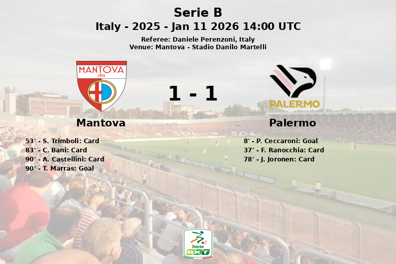 Mântua, Itália – Em um encontro disputado no Stadio Danilo Martelli, Palermo e Mântua empataram em um jogo da Série B que deixou um sabor agridoce para ambas as equipes. A partida, arbitrada por Daniele Perenzoni, viu o Palermo abrir o placar logo aos 8 minutos, com um gol de Palermo, após jogada iniciada por A. Vasic.