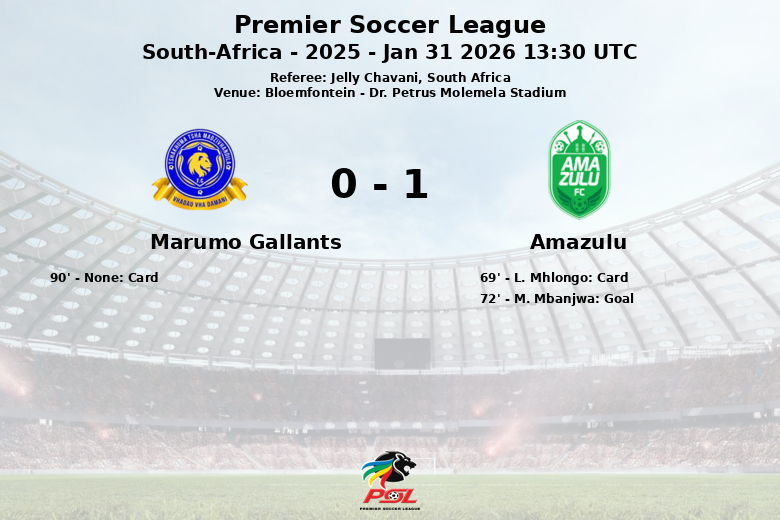 Bloemfontein, África do Sul – Em uma partida realizada no Dr. Petrus Molemela Stadium, o Amazulu conseguiu derrotar o Marumo Gallants em um jogo da Premier Soccer League. Apesar do domínio na posse de bola por parte do Marumo Gallants, com 68% em comparação com os 32% do Amazulu, foi este último quem soube aproveitar melhor as suas oportunidades. O Marumo Gallants criou nove chutes, com apenas dois direcionados ao gol. O Amazulu, por sua vez, realizou dez chutes, com cinco deles testando o goleiro adversário. O único gol da partida aconteceu aos 72 minutos, marcado por M. Mbanjwa após uma assistência de R. Hanamub, garantindo a vitória para o Amazulu. A partida foi marcada por um alto número de faltas, 14 por parte do Amazulu e 10 por parte do Marumo Gallants, e apenas um cartão amarelo foi mostrado a L. Mhlongo do Amazulu.