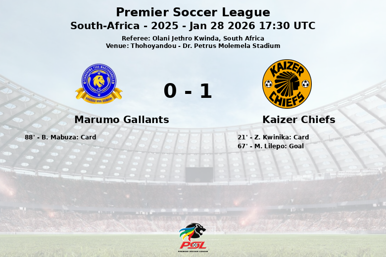 Thohoyandou, África do Sul – Em um jogo acirrado no Dr. Petrus Molemela Stadium, o Kaizer Chiefs garantiu uma importante vitória sobre o Marumo Gallants na Premier Soccer League. A partida, correspondente à 16ª rodada da temporada de 2025, foi caracterizada por um jogo tático e uma batalha no meio-campo.