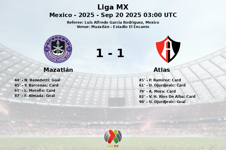 Mazatlán e Atlas empataram em um jogo disputado no Estádio El Encanto, pela 9ª rodada do Apertura da Liga MX. A partida, realizada em Mazatlán sob a arbitragem de Luis Alfredo Garcia Rodriguez, foi marcada pela intensidade e constantes interrupções.