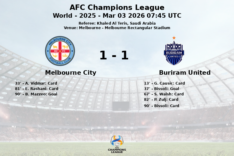 Melbourne, Austrália – O Melbourne Rectangular Stadium testemunhou um vibrante jogo da Liga dos Campeões da AFC entre o Melbourne City e o Buriram United, que culminou em um empate que deixou os torcedores à beira de seus assentos. A partida, arbitrada por Khaled Al Teris da Arábia Saudita, foi jogada com intensidade desde o primeiro minuto.