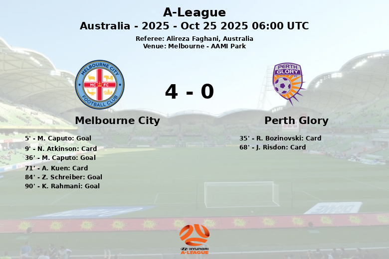 Melbourne, Austrália – Em uma partida disputada no AAMI Park, o Melbourne City demonstrou sua superioridade ao vencer o Perth Glory com um placar convincente. Desde o início, a equipe da casa impôs seu ritmo, refletido em uma posse de bola de 59% ao longo do encontro. M. Caputo se tornou a figura do jogo, marcando dois gols logo no início, o primeiro aos 5 minutos com assistência de M. Leckie e o segundo aos 36 minutos.