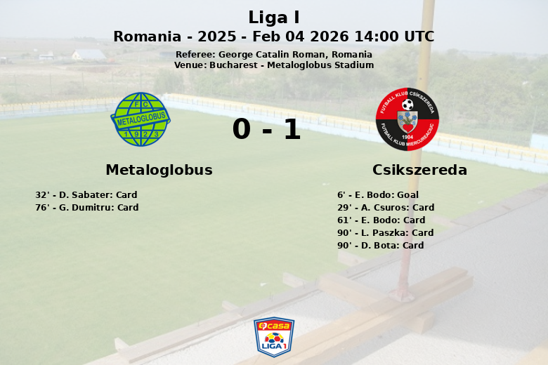 Em um jogo correspondente à 25ª rodada da Liga I romena, o Csikszereda conseguiu superar o Metaloglobus com um placar de 1 a 0. A partida, realizada no Estádio Metaloglobus em Bucareste, foi caracterizada pela alta posse de bola da equipe da casa (66%), que tentou criar perigo com 17 chutes, embora apenas 2 deles tenham encontrado o gol adversário.