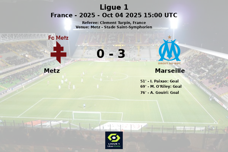 O Marselha demonstrou uma clara superioridade no ataque, refletida em seus 19 chutes totais, dos quais 8 foram no alvo. O Metz, por sua vez, só conseguiu gerar 4 chutes, com apenas um chute no alvo. A partida, arbitrada por Clement Turpin, transcorreu sem advertências para nenhuma das equipes. O placar final refletiu a diferença de jogo entre as duas equipes.