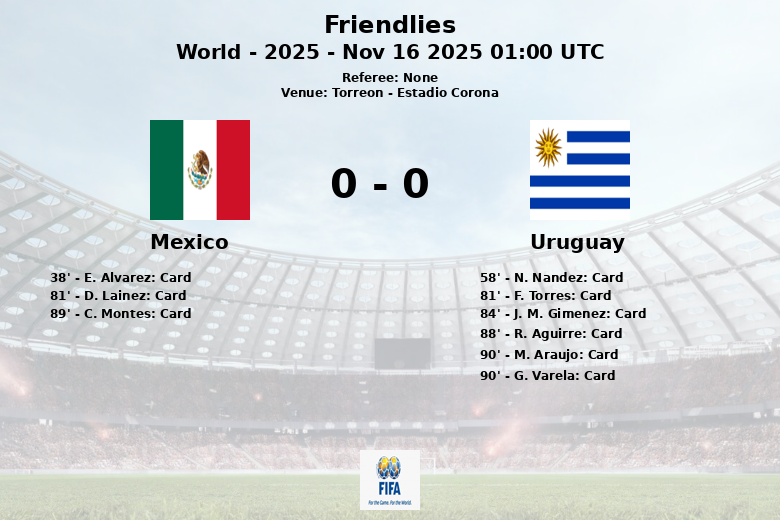 A partida foi interrompida por um total de 9 cartões amarelos mostrados pelo árbitro, 3 para o México e 6 para o Uruguai, evidenciando a intensidade e a luta constante pela bola. O encontro, embora amistoso, refletiu a competitividade entre ambas as seleções e a busca para ajustar suas estratégias em vista de futuros compromissos. O meio-campo foi o epicentro da batalha, com numerosas faltas cometidas por ambos os lados. Os torcedores que lotaram o Estádio Corona testemunharam um jogo disputado que, embora carecesse de gols, não economizou em emoção e dedicação por parte de ambas as equipes.