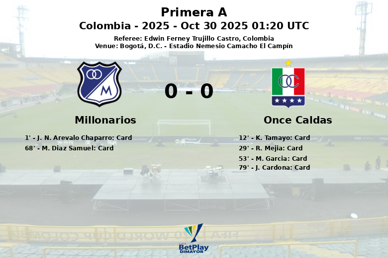 Bogotá, D.C. – Em uma partida disputada no Estádio Nemesio Camacho El Campín, Millonarios e Once Caldas empataram em 0 a 0 em um jogo correspondente à 18ª rodada do Clausura da Primera A. O árbitro Edwin Ferney Trujillo Castro apitou a partida, que foi marcada por constantes faltas e um alto número de cartões amarelos.