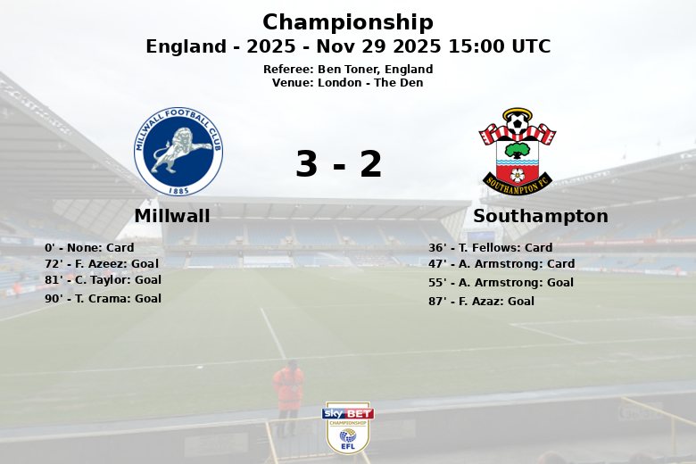 A partida começou com um cartão amarelo para o Millwall no primeiro minuto. O Southampton, apesar de ter mais posse de bola, não conseguiu marcar até ao minuto 55, quando A. Armstrong marcou de pênalti. O Millwall reagiu no minuto 72, graças a um gol de F. Azeez assistido por T. Crama, empatando o marcador. A alegria local continuou no minuto 81 com um gol de C. Taylor, assistido por C. De Norre, colocando o Millwall na frente. No entanto, o Southampton não desistiu, e F. Azaz empatou a partida no minuto 87. Quando parecia que o empate seria o resultado final, T. Crama marcou o gol da vitória para o Millwall no minuto 90, assistido por T. Ballo, selando um triunfo memorável para a equipe da casa. A partida foi caracterizada pela intensidade e luta no meio-campo, refletida nas 11 faltas cometidas pelo Millwall e nas 6 do Southampton. O Millwall também criou mais situações de perigo com 9 escanteios, em comparação com os 6 do Southampton.