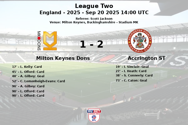 Milton Keynes, Buckinghamshire – O Accrington Stanley garantiu uma vitória sobre o Milton Keynes Dons em um jogo acalorado no Stadium MK, repleto de cartões e emoção. A partida, arbitrada por Scott Jackson, fez parte da nona rodada da League Two.