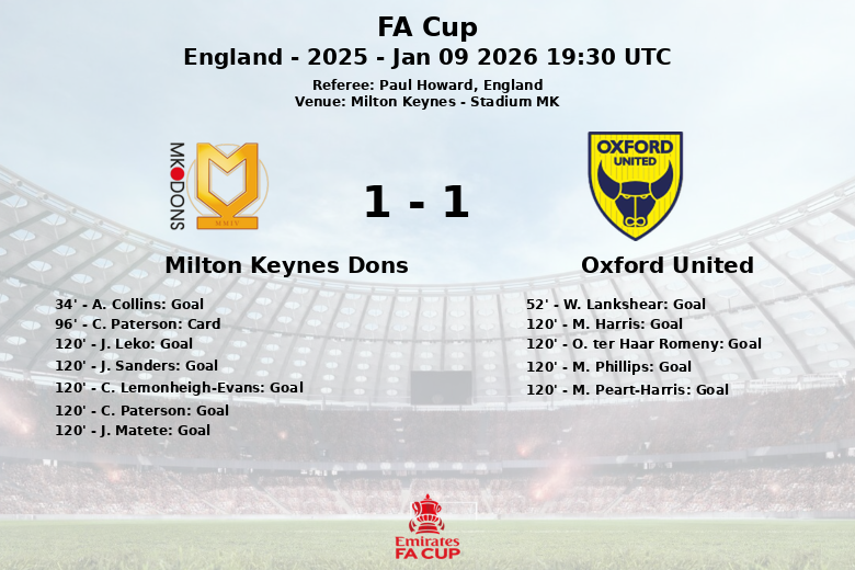 A partida permaneceu empatada durante o restante do tempo regulamentar e da prorrogação, com nenhuma das equipes conseguindo quebrar o impasse. A tensão atingiu seu pico durante a disputa de pênaltis. Apesar de um erro de J. Leko, o Milton Keynes Dons conseguiu marcar vários pênaltis, incluindo os de J. Sanders, C. Paterson e J. Matete. No entanto, o Oxford United mostrou-se implacável, convertendo seus chutes de pênalti graças a M. Harris, O. ter Haar Romeny, M. Phillips e M. Peart-Harris, garantindo assim sua passagem para a próxima fase da FA Cup. C. Lemonheigh-Evans perdeu o pênalti para o Milton Keynes Dons.