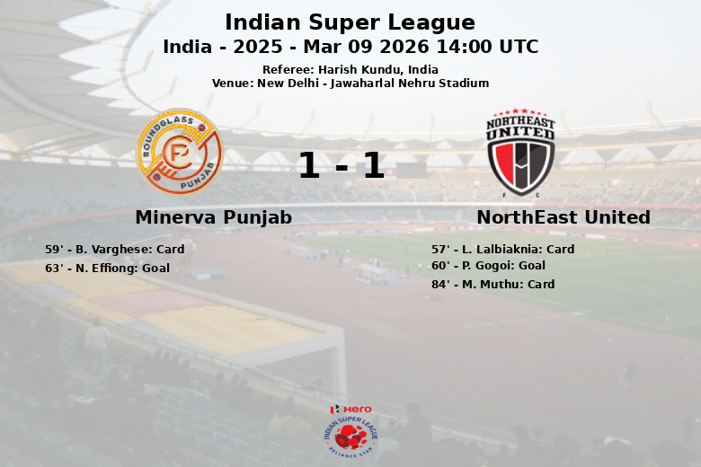 O jogo, disputado em 9 de março de 2026, foi acirrado e com oportunidades para ambas as equipes. NorthEast United abriu o placar aos 60 minutos com um gol de P. Gogoi, assistido por L. Lalbiaknia. No entanto, Minerva Punjab reagiu rapidamente e N. Effiong empatou aos 63 minutos, após um passe de M. Suhail F.