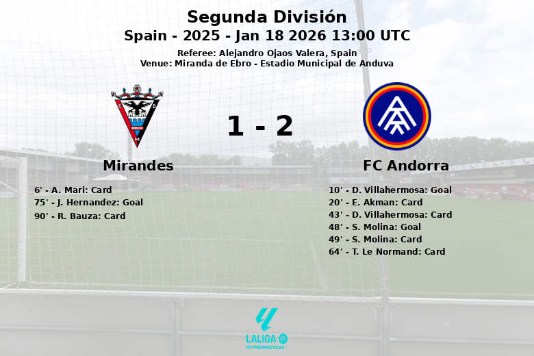 O Andorra dominou a posse de bola com 62% contra 38% do Mirandés. Daniel Villahermosa abriu o placar para o Andorra aos 10 minutos, após assistência de Y. Cabanzon. O Andorra ampliou a vantagem aos 48 minutos graças a um gol de Sergio Molina. O Mirandés diminuiu o placar aos 75 minutos com um gol de J. Hernández, após passe de M. Illesca, mas não foi o suficiente para igualar o marcador.