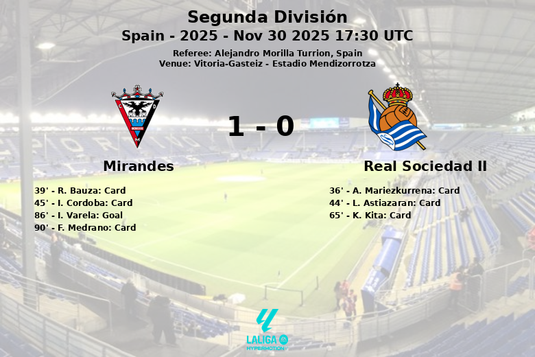 O Mirandés finalmente encontrou a chave do gol aos 86 minutos, graças a I. Varela, que aproveitou uma assistência de F. Medrano para desencadear a euforia na torcida visitante. Apesar das tentativas do Real Sociedad II de empatar, o Mirandés conseguiu manter a vantagem até o apito final, conquistando assim uma valiosa vitória em Vitoria-Gasteiz. A partida terminou com o Mirandés cometendo 15 faltas e o Real Sociedad II cometendo 14, evidenciando o quão disputado foi o jogo.