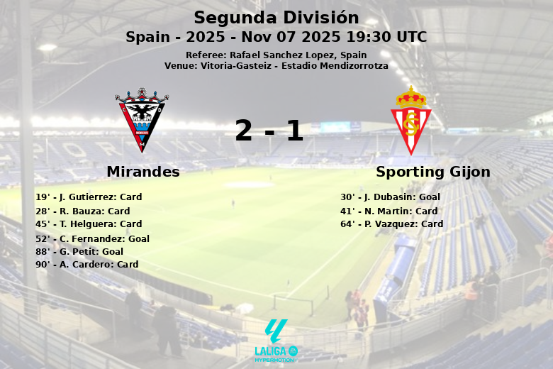 Vitoria-Gasteiz, Espanha – Num jogo disputado no Estadio Mendizorrotza, o Mirandés conquistou uma valiosa vitória contra o Sporting Gijón num encontro que manteve os adeptos à beira dos seus assentos. Com uma posse de bola de 46%, o Mirandés mostrou um jogo ofensivo insistente, culminando em 17 remates, dos quais 8 foram à baliza. O Sporting Gijón, embora tenha dominado a posse de bola com 54%, não conseguiu materializar o seu controlo num maior número de oportunidades claras, registando 6 remates, com apenas 2 direcionados à baliza adversária.
