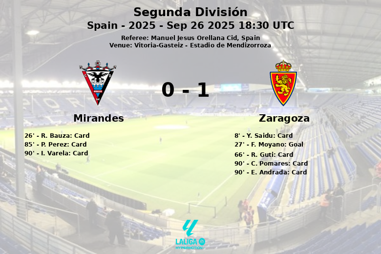 Vitoria-Gasteiz, Espanha – Num jogo disputado no Estádio de Mendizorroza, o Zaragoza conquistou três valiosos pontos contra um Mirandés que lutou até ao apito final. A partida, válida pela sétima jornada da Segunda División da temporada de 2025, foi marcada pela intensidade e pelas frequentes interrupções.