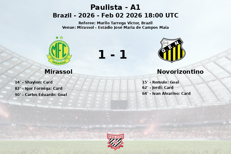 Mirassol, Brasil – Em um jogo disputado no Estádio José Maria de Campos Maia, Mirassol e Novorizontino empataram com um placar final de um a um. O Novorizontino abriu o placar aos 15 minutos com um gol de Rómulo. A partida foi caracterizada pela alta posse de bola do Mirassol (73%), embora o Novorizontino tenha se defendido solidamente. O jogo também foi marcado por vários cartões amarelos, dois para cada equipe. O Mirassol demonstrou maior vocação ofensiva, com 20 chutes no total, embora apenas 6 tenham sido no alvo. Finalmente, aos 90 minutos, Carlos Eduardo conseguiu igualar o marcador para o Mirassol, gerando euforia no estádio.