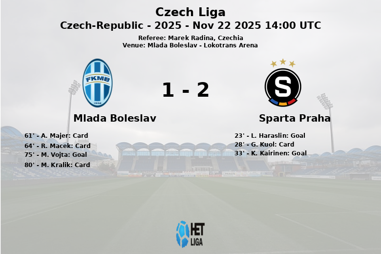 O Sparta Praga garantiu uma vitória valiosa em sua visita ao Mlada Boleslav em uma partida que teve seus momentos de intensidade. O jogo, disputado na Lokotrans Arena em Mlada Boleslav, viu o Sparta Praga assumir a liderança graças a um pênalti convertido por L. Haraslin aos 23 minutos. K. Kairinen ampliou a vantagem aos 33 minutos com um gol que parecia selar a partida.