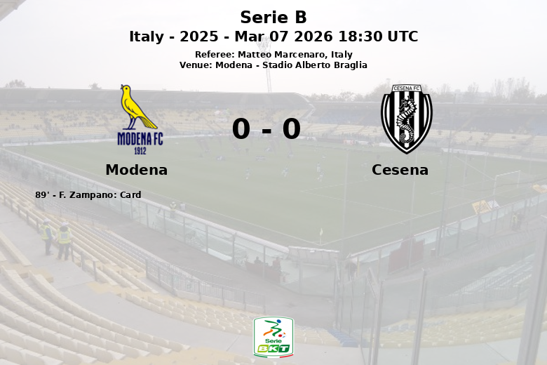 Modena, Itália – Em uma partida realizada no Stadio Alberto Braglia, Modena e Cesena empataram em 0 a 0 em um encontro da Serie B caracterizado pela intensidade tática e poucas oportunidades claras de gol. O Modena dominou a posse de bola com 56%, gerando um número maior de chutes (17 no total, 4 no alvo), mas não conseguiu romper a defesa do Cesena. O time da casa também acumulou 7 escanteios, sem conseguir capitalizá-los. O Cesena, por sua vez, mostrou-se sólido na defesa, limitando os chutes a gol do Modena e buscando contra-ataques esporádicos. A equipe visitante gerou apenas 3 chutes, com apenas um direcionado ao gol. A partida, arbitrada por Matteo Marcenaro, foi marcada por um total de 18 faltas (8 do Modena e 10 do Cesena), e um cartão amarelo mostrado a um jogador do Modena nos minutos finais. Apesar do domínio territorial do Modena, a partida terminou sem gols, refletindo a paridade e a abordagem defensiva de ambas as equipes.