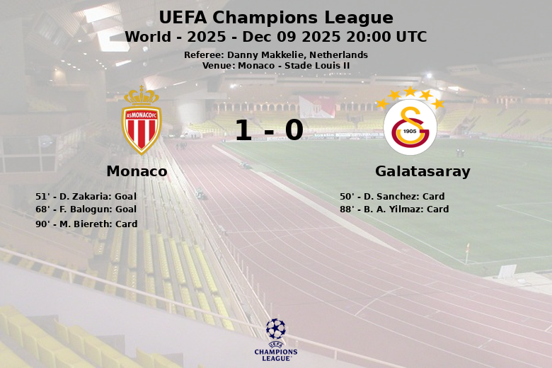 Mónaco, 9 de dezembro de 2025 – O AS Mónaco venceu o Galatasaray na partida correspondente à 6ª jornada da fase de grupos da Liga dos Campeões da UEFA, disputada no Stade Louis II. O encontro, apitado pelo árbitro Danny Makkelie, foi marcado pela intensidade e luta no meio-campo.
