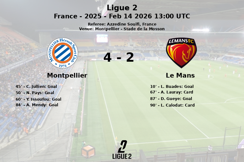 Montpellier, 14 de fevereiro de 2026 – Em um confronto vibrante realizado no Stade de la Mosson, o Montpellier derrotou o Le Mans por 4-2, em partida válida pela 23ª rodada da Ligue 2. O jogo, arbitrado por Azzedine Souifi, testemunhou um início promissor para o Le Mans, que abriu o placar aos 10 minutos com um gol de L. Buades, assistido por E. Colas. No entanto, o Montpellier reagiu antes do intervalo, empatando o placar com um gol de C. Jullien aos 45 minutos, assistido por N. Mbuku.
