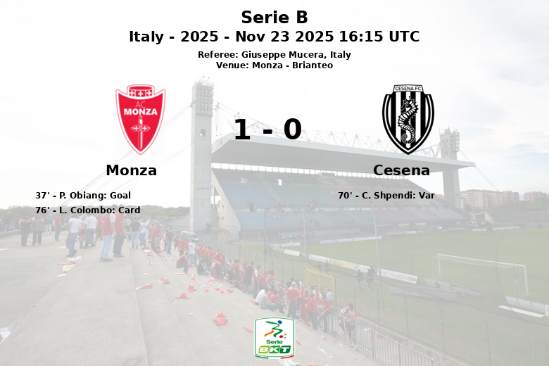 O Monza, com 52% de posse de bola, conseguiu garantir a vitória graças a um gol de P. Obiang aos 37 minutos, assistido por D. Mota. Embora o Cesena tenha mantido 48% de posse e superado o Monza em número de chutes, com 15 tentativas contra 14 da equipe da casa, apenas quatro de seus chutes foram no alvo, em comparação com um do Monza. A equipe visitante teve ainda um gol anulado por impedimento de C. Shpendi aos 70 minutos.