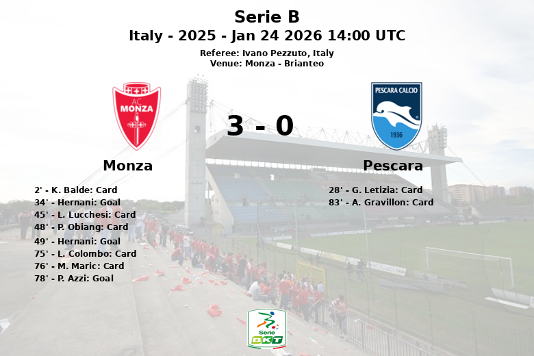 Apesar de uma posse de bola ligeiramente favorável ao Pescara (51% contra 49% do Monza), foi a equipe da casa quem dominou as ações de perigo. Hernani se destacou como a figura do jogo ao marcar dois gols, o primeiro aos 34 minutos com assistência de A. Carboni, e o segundo aos 49 minutos, desta vez assistido por P. Azzi. O placar final foi selado aos 78 minutos com um gol de P. Azzi, assistido por L. Colombo.