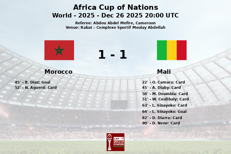 Rabat, 26 de dezembro de 2025 – Marrocos e Mali empataram em 1 a 1 em um jogo tenso e disputado no Complexe Sportif Moulay Abdellah, válido pela fase de grupos da Copa Africana de Nações. A partida, arbitrada por Abdou Abdel Mefire, foi marcada pela intensidade e pelas inúmeras faltas.