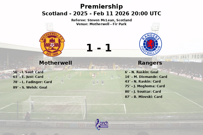 Motherwell, Escócia – Em um jogo disputado em Fir Park, o Rangers garantiu uma vitória apertada contra o Motherwell, em uma partida marcada pela intensidade e cartões. O gol inicial de N. Raskin aos 6 minutos, com assistência de M. Diomande, colocou o Rangers à frente. No entanto, a partida se tornou física e tática, com uma série de advertências para ambas as equipes.