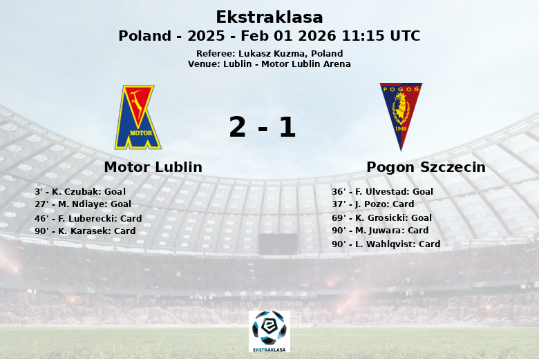 Lublin, Polônia – Em uma partida vibrante realizada na Motor Lublin Arena, o Motor Lublin derrotou o Pogon Szczecin por 2 a 1. A partida, válida pela 19ª rodada da Ekstraklasa, Temporada 2025, foi repleta de emoção desde o apito inicial.