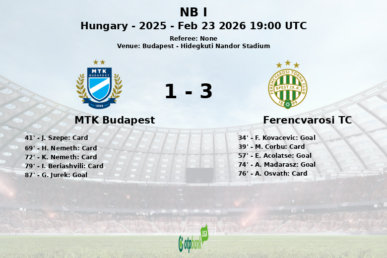 O Ferencvarosi TC abriu o placar aos 34 minutos com um gol de F. Kovacevic, marcando o início de seu domínio. E. Acolatse ampliou a vantagem aos 57 minutos. O MTK Budapest lutou para conter o ataque do Ferencvarosi, resultando em vários cartões amarelos. A frustração da equipe da casa tornou-se evidente. A. Madarasz selou a vitória para o Ferencvarosi aos 74 minutos.