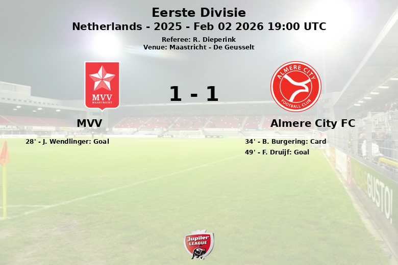 Um autogolo de J. Wendlinger aos 28 minutos adiantou surpreendentemente o MVV. No entanto, o Almere City FC não desistiu e encontrou o empate aos 49 minutos graças a um golo de F. Druijf. Apesar das tentativas de ambas as equipas, o marcador não se moveu mais, deixando o jogo com um resultado final de 1-1. O Almere City FC teve uma ligeira vantagem em cantos, somando 11 contra 1 do MVV. O árbitro R. Dieperink admoestou B. Burgering do Almere City FC. O jogo foi disputado no âmbito da jornada 22 da temporada de 2025 da Eerste Divisie.