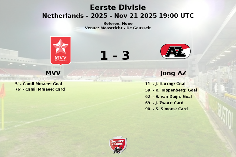 O MVV abriu o placar cedo com um gol de Camil Mmaee aos 5 minutos, gerando esperanças entre os torcedores locais. No entanto, o Jong AZ respondeu rapidamente com um gol de J. Hartog aos 11 minutos, empatando o placar e definindo o tom para o restante da partida.