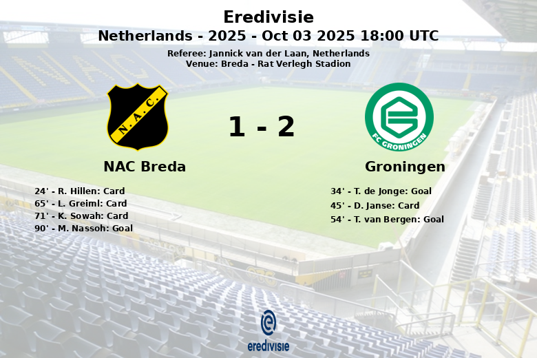 Apesar do NAC Breda ter dominado a posse de bola, o Groningen garantiu a vitória graças à sua maior eficácia em frente ao gol. O NAC Breda, jogando em casa no Rat Verlegh Stadion, manteve o controle da bola com 61% de posse, gerando 9 chutes, dos quais 4 foram ao alvo. No entanto, foi o Groningen quem abriu o placar aos 34 minutos com um gol de T. de Jonge. O primeiro tempo terminou com um cartão amarelo para D. Janse do Groningen.