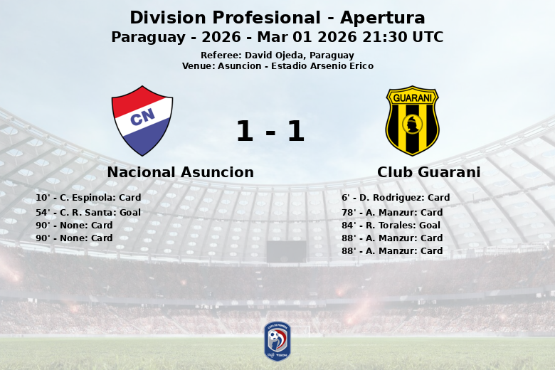 Assunção, Paraguai – Um disputado confronto entre Nacional de Assunção e Club Guaraní terminou em empate de 1-1 no Estádio Arsenio Erico, em partida válida pela oitava rodada do Apertura da Divisão Profesional. O jogo, apitado por David Ojeda, foi marcado pela intensidade e pelo jogo truncado, refletido na quantidade de cartões mostrados.