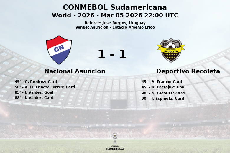 Deportivo Recoleta abriu o placar pouco antes do intervalo com um gol de K. Parzajuk, após assistência de A. Franco, que havia recebido um cartão amarelo anteriormente. Nacional Asunción, com maior posse de bola (56%), lutou para igualar o marcador, mas encontrou uma defesa sólida e recebeu vários cartões amarelos.