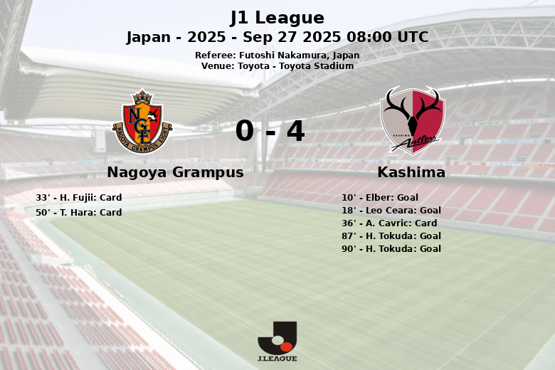 Toyota, Japão – Em um jogo disputado no Toyota Stadium, o Kashima Antlers derrotou o Nagoya Grampus com um placar final de 4 a 0, em partida correspondente à 32ª rodada da J1 League.