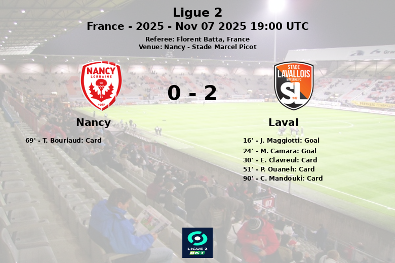 Nancy, França – Em uma partida disputada no Stade Marcel Picot, o Laval conquistou uma importante vitória sobre o Nancy. Apesar do domínio na posse de bola por parte do Nancy, com 61%, o Laval soube aproveitar suas oportunidades para levar os três pontos.
