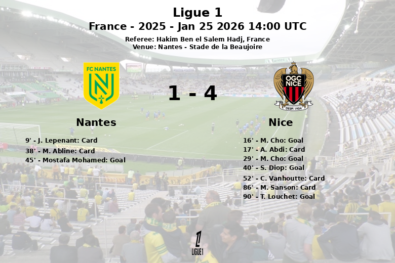 Nantes, França – Em um encontro vibrante e cheio de ação disputado no Stade de la Beaujoire, o Nice demonstrou seu poderio ofensivo ao vencer o Nantes com um placar final de 4 a 1. Apesar de o Nantes ter dominado a posse de bola com 56% contra 44% do Nice e ter gerado um maior número de chances de gol (20 chutes totais, 5 no alvo) contra os 6 chutes (3 no alvo) do Nice, a efetividade do Nice foi a chave da vitória.