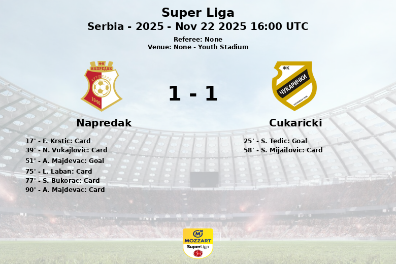 A partida disputada no Youth Stadium pela 16ª rodada da Super Liga Sérvia entre Čukarički e Napredak terminou em um empate que manteve os torcedores na ponta de seus assentos. O Čukarički dominou a posse de bola com 62% contra 38% do Napredak, e também gerou mais oportunidades de gol, com 19 chutes no total, dos quais 6 foram no alvo. O Napredak, por outro lado, foi mais contido no ataque, com 5 chutes no total e apenas um que exigiu do goleiro adversário.