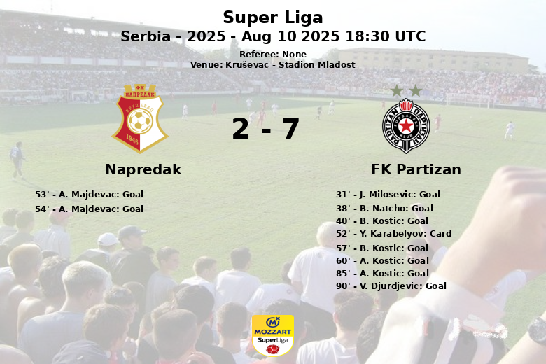 No segundo tempo, o Napredak mostrou sinais de recuperação com gols de A. Majdevac aos 53 e 54 minutos, buscando voltar ao jogo. No entanto, o Partizan respondeu com firmeza. B. Kostic marcou novamente aos 57 minutos, seguido por A. Kostic aos 60 minutos. A tempestade ofensiva do Partizan continuou com gols de A. Kostic aos 85 minutos e de V. Djurdjevic aos 90 minutos, selando uma vitória dominante.